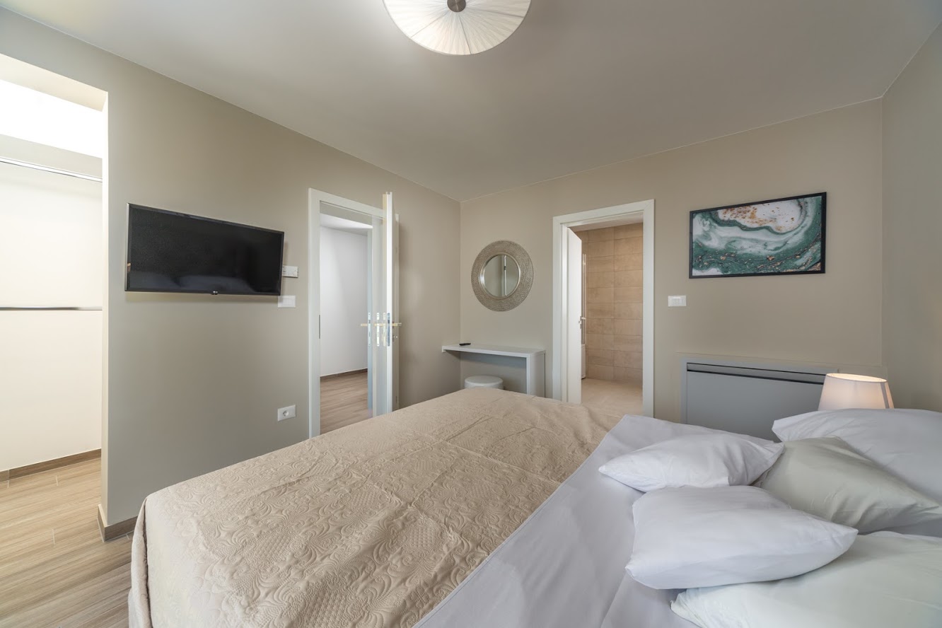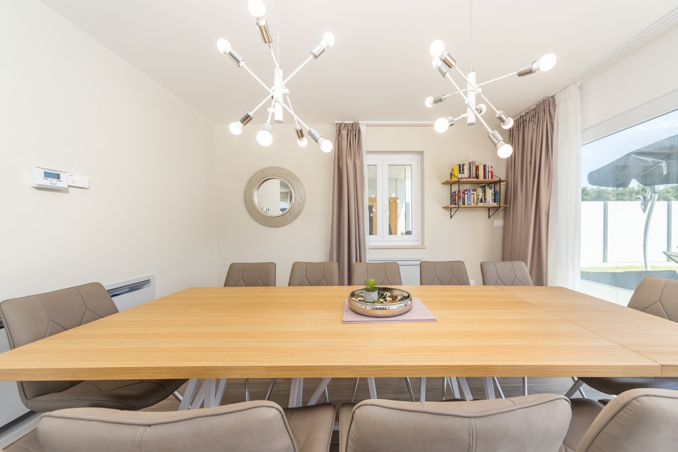 6 bedrooms with TV, 4 bathrooms (1 bath, 3 shower cabins), hair dryer, irons, ironing boards, vacuum cleaners, washing machine, safe, kitchen with dishwasher, microwave and oven, dining table with 12 seats places, heated pool of 26.5 m2 with a waterfall and massage pumps, jacuzzi, sauna, deck chairs, exercise bike, children's playground, trampoline, collection of books in English, German and Italian board games and toys for children.